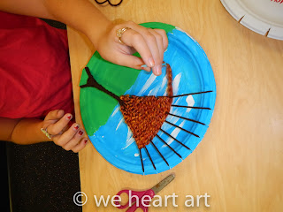 We started by painting a simple landscape on the plate with tempera paints. When they were dried I gave them a cutting template with 9 cuts on the top and 2 on the bottom to string the loom for the "tree".